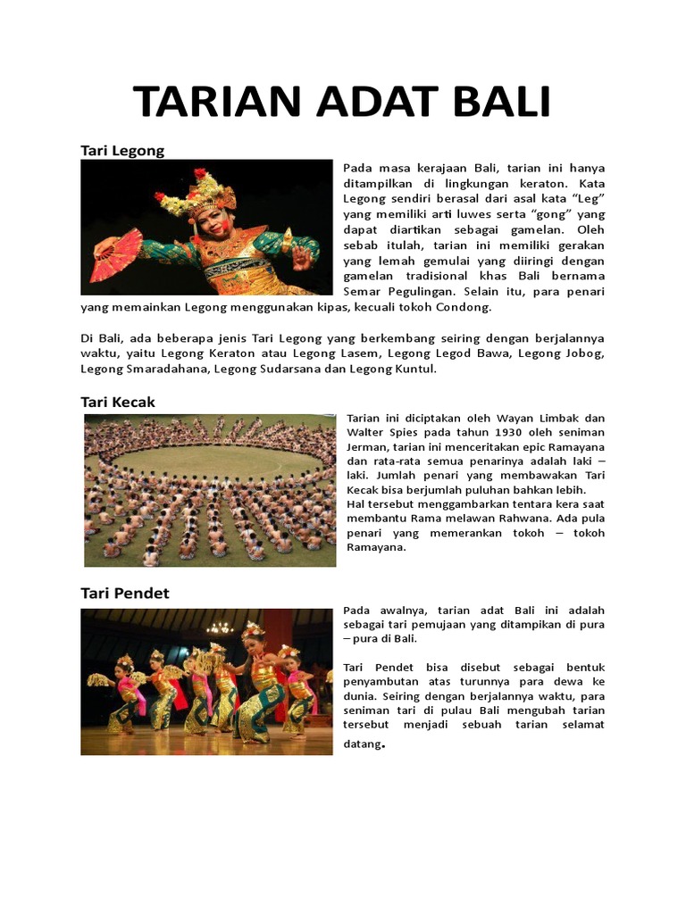 Tarian ini memiliki gerakan yang diambil dari beberapa tarian adat seperti tari pendet dan tari gabor. Jika anda ingin belajar berbagai jenis tari bali, biasanya anda akan diajari tari pendet terlebih dahulu karena gerakan tari pendet merupakan gerakan basic yang cukup mudah dipelajari oleh semua kalangan. Penggunaan suatu media atau properti ini berkaitan dengan kreativitas. Pola lantai rakit lajur bermaksud menggambarkan lima unsur yang ada pada diri manusia, yaitu cahaya, rasa, sukma, nafsu, dan perilaku. Hal tersebut menggambarkan tentara kera saat membantu rama melawan rahwana. Akan tetapi, tari yang satu ini umumnya dipentaskan oleh wanita ataupun para gadis. Para penari duduk melingkar dan menyerukan cak sambil mengangkat kedua tangan. Tari pendet tari pendet pada awalnya merupakan tari pemujaan yang banyak diperagakan di pura, tempat ibadat umat hindu di bali, indonesia. Tahun 1950 tercatat sebagai tahun kelahiran tari tersebut. Simak gerakan tari pendet, dinamis sekaligus sakral. Tari pendet termasuk dalam jenis tarian wali, yaitu tarian bali yang dipentaskan khusus untuk keperluan upacara keagamaan. Penari cenderung melakukan gerakan serentak atau unisan dalam jumlah genap, misalnya enam orang, sehingga membuatnya nampak teratur dan melakukan gerakan sama. Tersebut seorang maestro seni tari dari bali bernama i wayan rindi yang telah dikenal luas sebagai penggubah tari pendet.